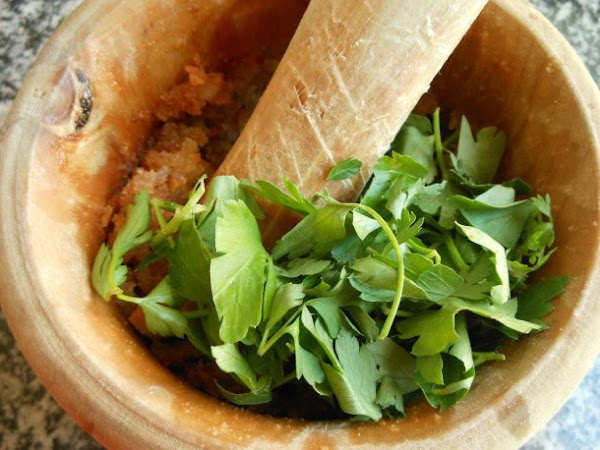 Tras esto, retira las rebanadas de pan y los dientes de ajo de la sartén e introdúcelos en el mortero junto a unas ramas frescas de perejil.