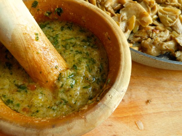 Seguidamente añade al mortero un poco de caldo de pollo o en su defecto agua y remueve bien hasta desprender bien el majado .