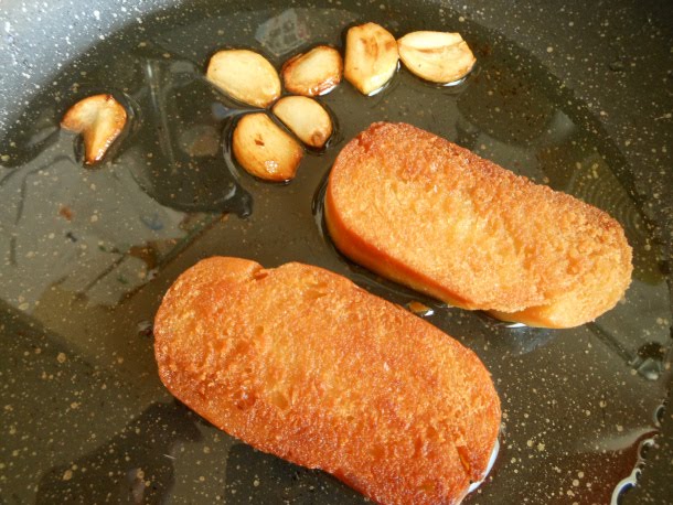 Introduce los dientes de ajo y las rebanadas de pan en el aceite caliente y déjalos que se frían hasta que estén dorados; dale la vuelta a los ajos y a las rebanadas de pan con la ayuda de las pinzas de cocina para que se doren bien por ambos lados. Retira la sartén del fuego y reserva el aceite.