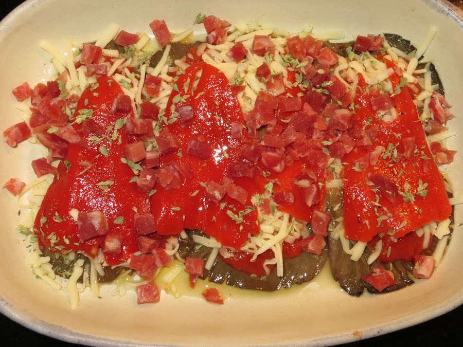 Engrasamos una fuente para horno y colocamos las setas encima, echamos las cucharadas de tomate frito, el queso mozzarella, los pimientos cortados en varios trozos y los tacos de jamón y esparcimos un poco de orégano por encima.