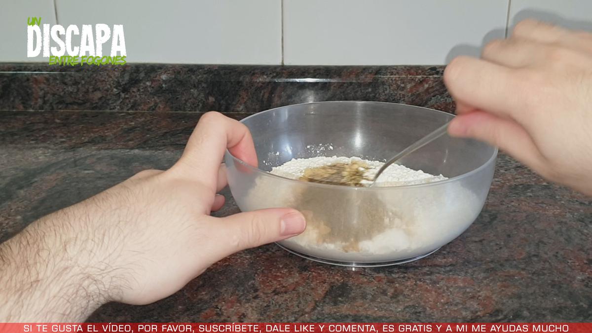 1En este bol tengo 250 gramos de harina de trigo al que le vamos a añadir una cucharadita de sal, ajo en polvo, cebolla en polvo, comino en polvo, curry, pimienta negra molida, pimentón de la vera, romero y 1 cucharadita de salsa de soja, mezclamos bien para que se integren todos los ingredientes y después vamos a ir añadiendo una bebida vegetal poco a poco, yo en este caso estoy utilizando bebida de arroz.