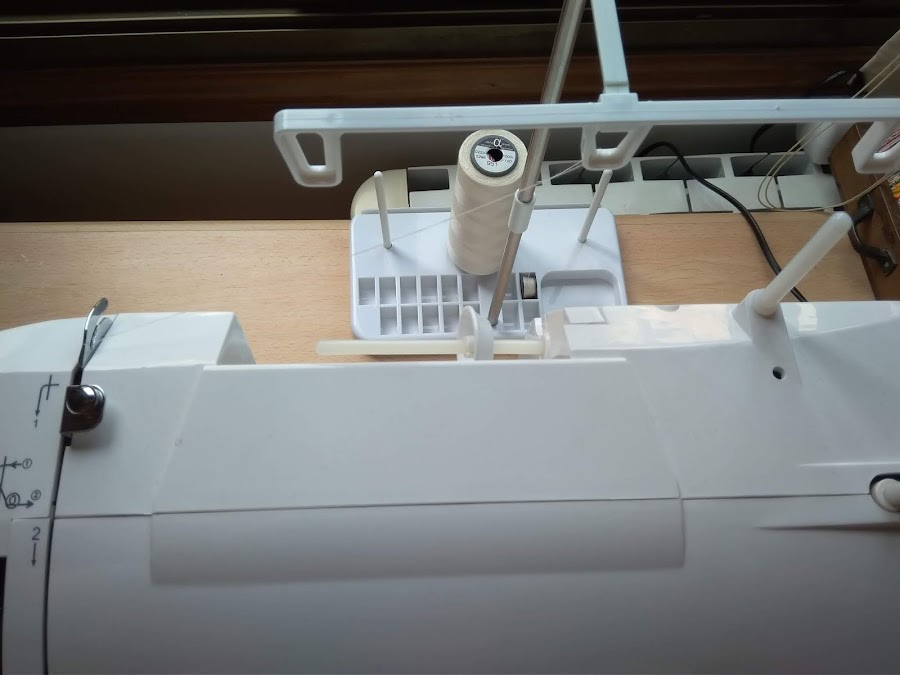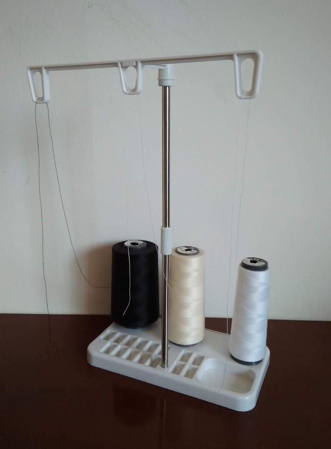Así que ahora tengo este soporte y lo coloco detrás de la máquina y ya desde ahí me va genial para la máquina. Si os interesa os dejo el link de amazon. Cuesta 7€ y creo que tiene envío gratuito. Tiene sitio para tener 3 carretes y podéis guardar canillas también.