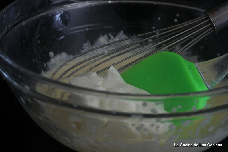 Añade poco a poco la leche a la crema de huevo para que no se te cuajen. Incorpora al cazo y llévalo al fuego sin parar de remover hasta que la crema empiece a engordar. Retira del fuego, cuela para quitar impurezas, añade el queso y el zumo de limón sin parar de batir con las varillas.