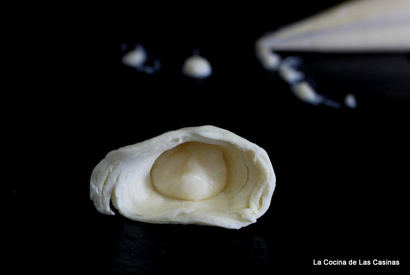 Coloca la mano izquierda formando un círculo con los dedos pulgar e índice. Coloca una pieza y con el pulgar de la otra mano extiende la masa formando un cuerno. Rellena con la crema y sella las dos partes de la masa.