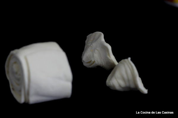 Reserva en una manga pastelera en la nevera. Divide el rollo de masa en 8 porciones de tamaño más o menos igual.