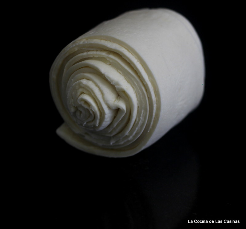 Con un cuchillo afilado divide en dos la masa y cada parte en tres iguales. Pincela con abundante mantequilla o manteca cada una de las tres partes. Suporpone cada una de ellas y forma un rollito apretado como el de la foto.