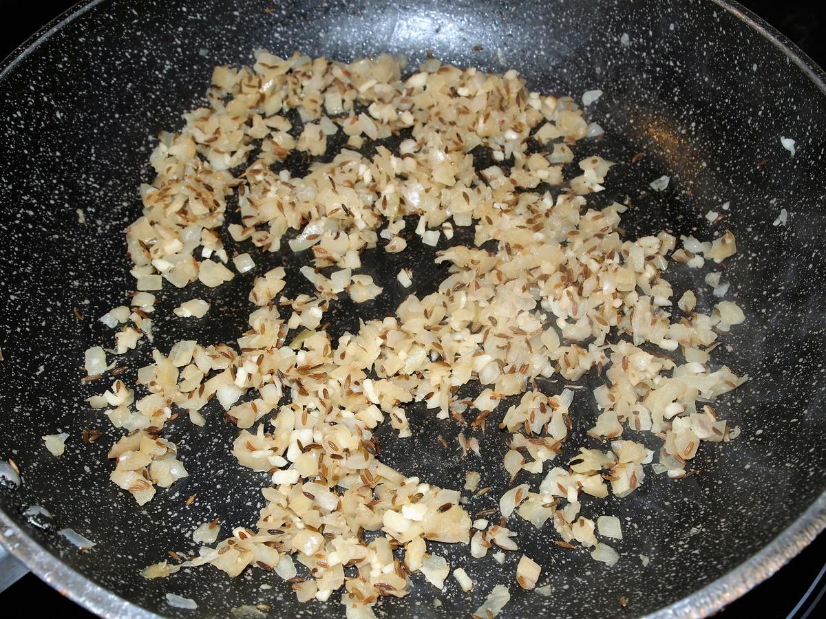 En una sartén grande, sofreímos la cebolla y el ajo con la ½ cucharadita de aceite. Cuando empiece a transparentar agregamos el comino.