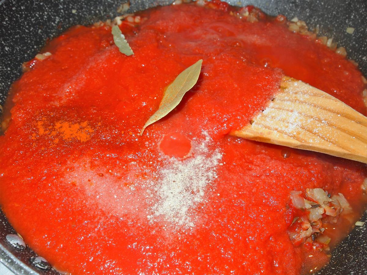 Hora de incorporar el concentrado de tomate, el tomate rallado, el laurel, la sal, pimienta y cayena al gusto. Dejamos que se cocine a fuego medio/suave unos 7 minutos. Mejor sin tapar, ya que se debe evaporar el agua del tomate. Tras 7 minutos o cuando veamos que la salsa empieza a espesar nos preparamos para poner los huevos.