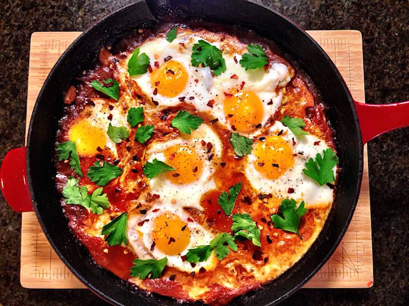 Cuando veamos que el agua de los tomates se ha evaporado, con una cuchara creamos varios huecos para ‘acunar’ los huevos, con cuidado de no romper la yema. Tapamos la sarten y terminanos de cocinar a fuego lento de 10 a 15 minutos, al gusto. Se sirve salpimentando al gusto y decorándolo con perejil muy picadito por encima.