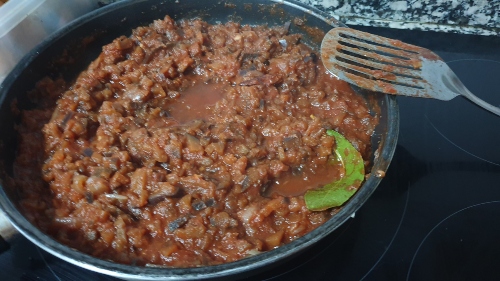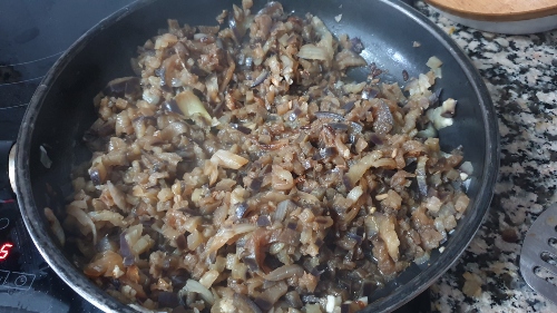 A los cinco minutos, añade la berenjena y pocha a fuego lento hasta que esté todo tierno.