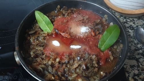 - Sube el fuego y cuando empiece a burbujear bájalo casi al mínimo y cocina a fuego lento (sin tapar) hasta que el tomate esté cocinado y el agua de vegetación se haya evaporado casi totalmente.
