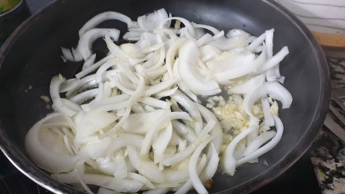 - Pon una sartén amplia a calentar con un chorro de aceite de oliva virgen extra, incorpora la cebolla, los ajos, y los pimientos, si los pones.