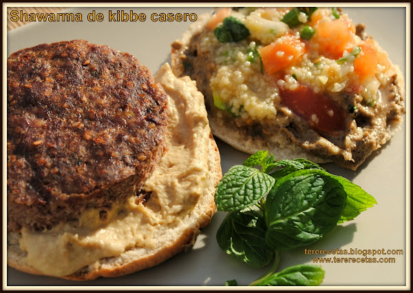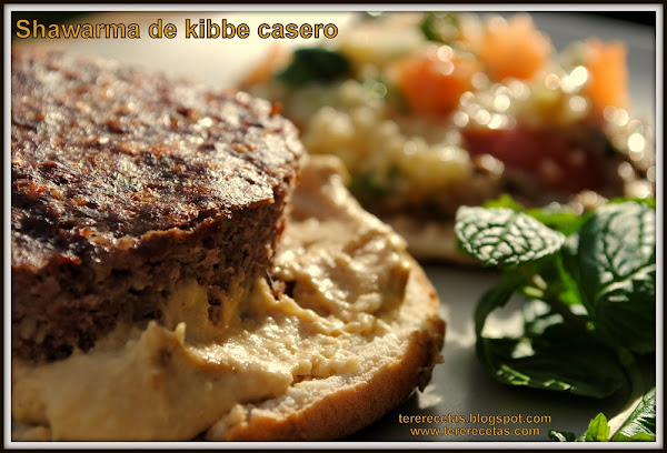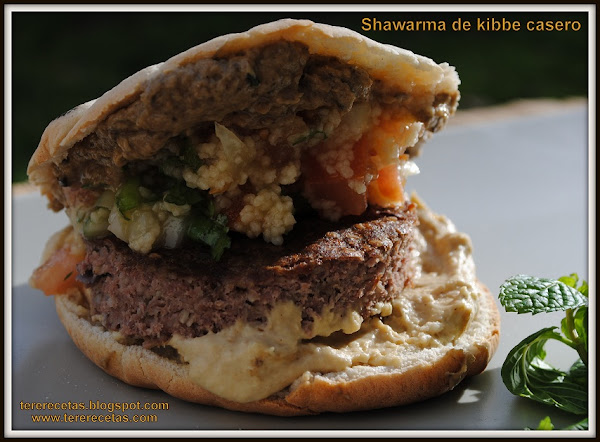 El shawarma (árabe) o döner kebab (turco) o gyros (griego) es un plato originario del Medio Oriente que consiste en finas láminas de carne de cordero, pollo o ternera asada en un asador vertical, consumidas en el interior de un pan de pita junto con vegetales y otros acompañamientos, yo lo preparé con la carne que hice para el kibbe al horno (sin usar el tradicional asador vertical) acompañado con tabule y salsas de hummus y baba ganouj todo dentro de un pan de pita tostado al horno.