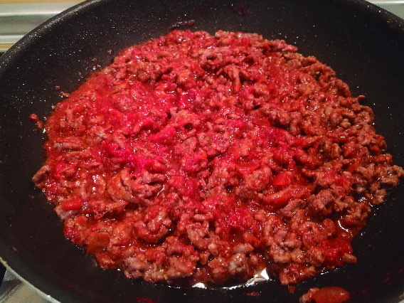 Retiramos el tomate frito de la sartén. Echamos aceite y cuando se caliente echamos la carne picada hasta que se dore. Cuando esté dorada echamos el tomate frito que hemos hecho antes y dejamos cocinar 5 minutos. Retiramos del fuego dejamos enfriar antes de emplatar.