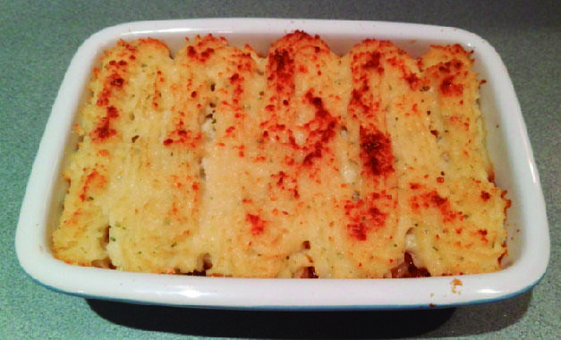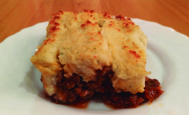El plato original es una base de carne picada de cordero con algunas verduras hecho todo a fuego lento y ello bien cubierto de una generosa capa de puré de patata casero que finalmente se hornea para que quede la superficie crujiente.