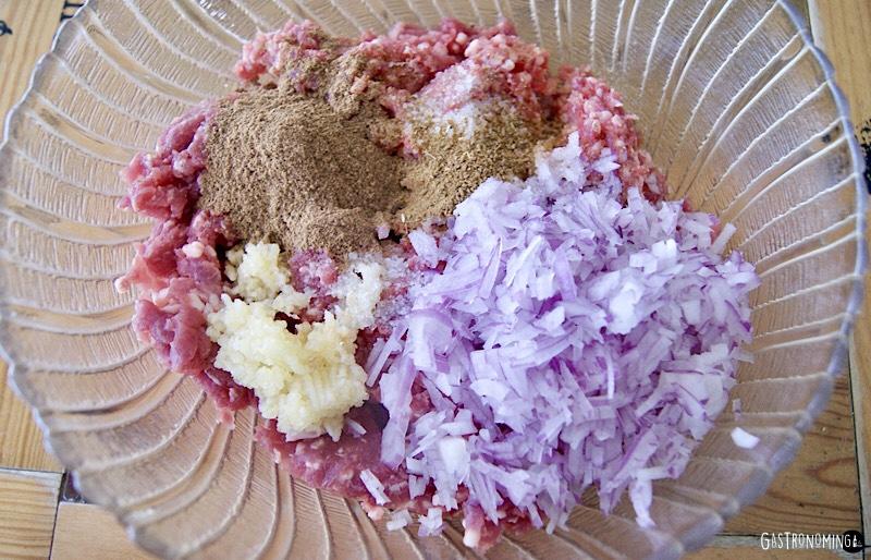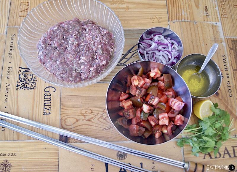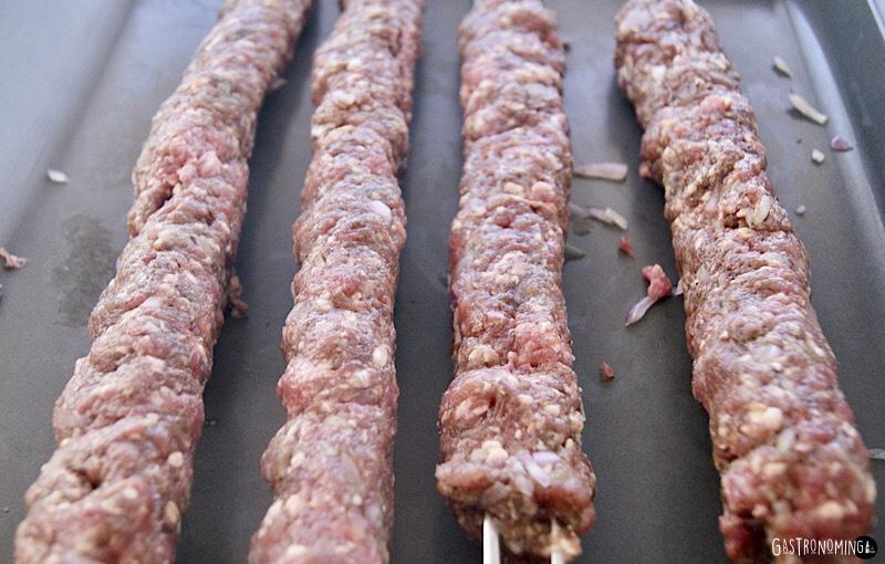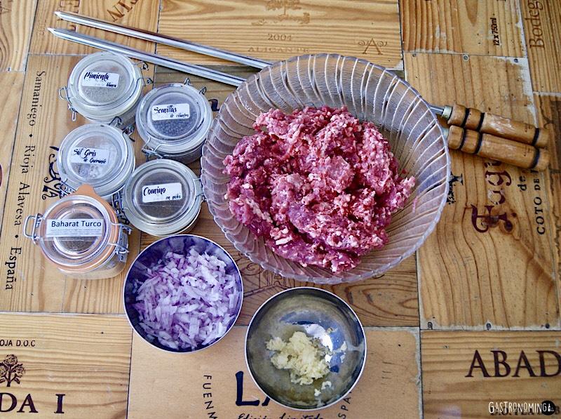 1. En un bol amplio colocamos todos los ingredientes menos los de acompañamiento y con las manos mezclamos bien hasta obtener una mezcla homogénea. Cubrimos y guardamos en frío al menos 12 horas si tenemos tiempo.2. Ahora vamos a poner la carne en las brochetas metálicas, puedes usar grandes para presentar en la mesa o individuales para servir en el plato, para hacer las brochetas sería bueno tener las manos húmedas pasadas por agua para evitar que la carne se nos pegue a los dedos y hacer facilitarnos el trabajo. Vamos apretando y moldeando la carne con las manos a lo largo de los pinchos. Dejaremos una especie de “salchicha” de entre 1,5 a 2 centímetros de diámetro. (ver foto 5)