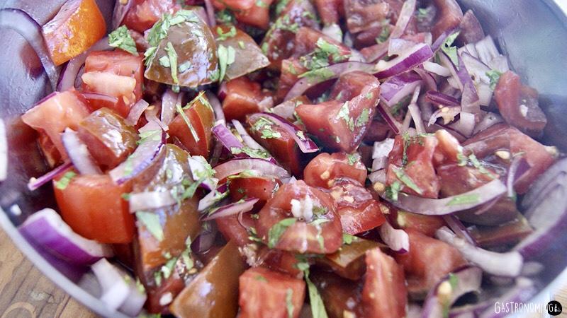 Pan lavash, tomates y cebollas cortadas o picadas, unas hojas cilantro, menta fresca o perejil fresco picado y un aderezo* de aceite de oliva, zumo de limón, ajos y perejil picado.