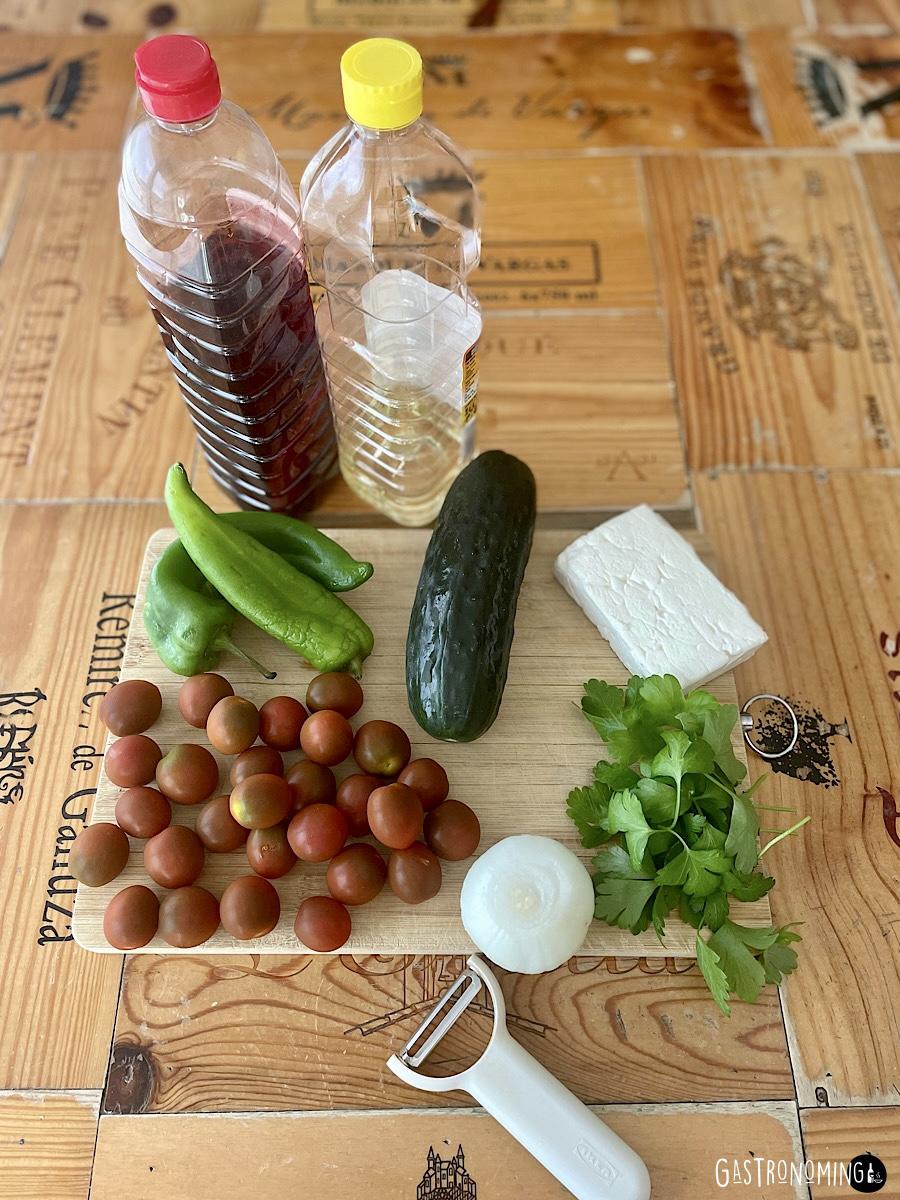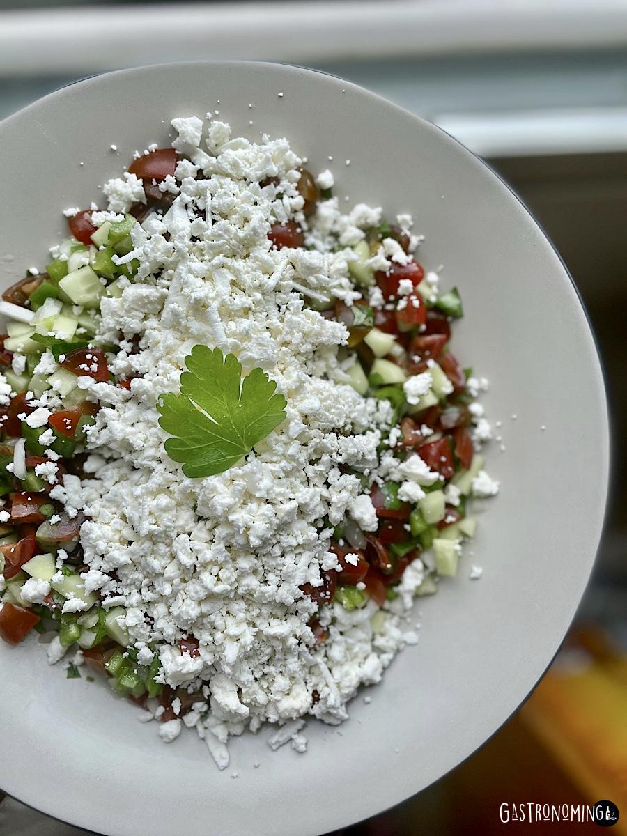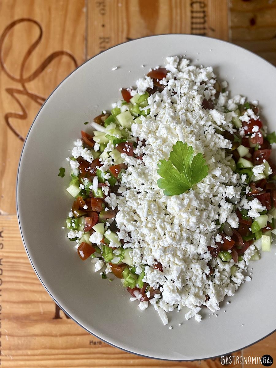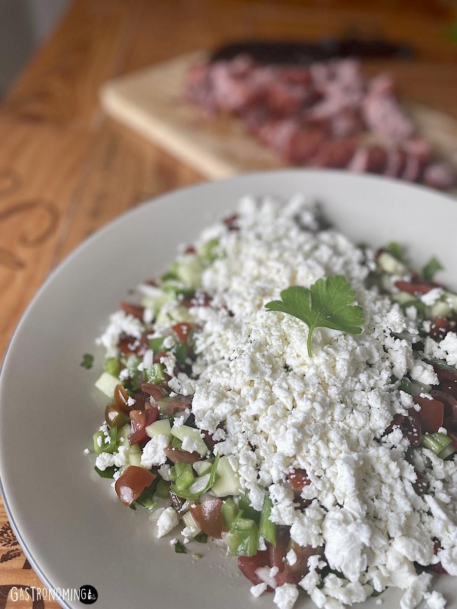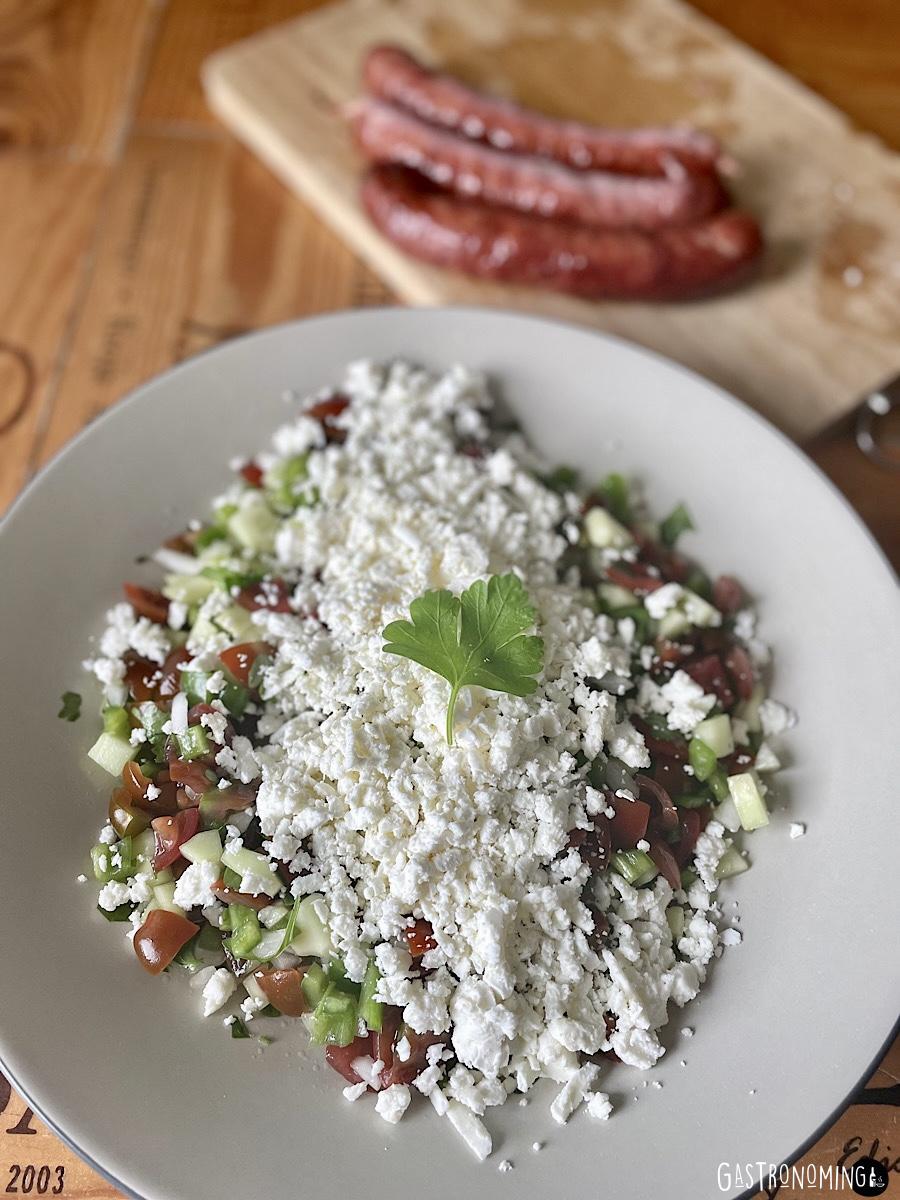 La receta es muy básica y cómo toda receta popular tiene sus variantes, en este caso, los ingredientes que componen la comuna vertebral de la ensalada y nunca deben faltar son, los tomates maduros con todo su frescor, el pepino y el queso Sirene, un queso fresco blanco en salmuera hecho de leche de cabra, oveja, vaca o una mezcla de todas, firme, con un punto salado y conocido como el Feta búlgaro, este queso es algo más suave, menos firme, más húmedo y fácil de desmenuzar que el Feta, pero no son muy diferentes. Este queso es muy popular no solo en la península balcánica, sino en todo el sureste de Europa. si omites el queso, lo que estarás haciendo es una srpska salata (ensalada serbia) y si no puedes encontrarlo, siéntete libre de usar queso Feta y si no, pues usa un queso blanco fresco de tu localidad.