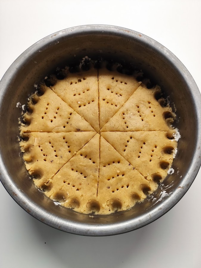 Para decorar el borde del shortbread nos ayudamos con las puntas de los dedos enharinados presionando hacia abajo todo el contorno para darle una forma rizada. Con un cuchillo marcamos ligeramente ocho porciones y con un tenedor pinchamos cada trozo tres veces, para darle el aspecto original del shortbread.