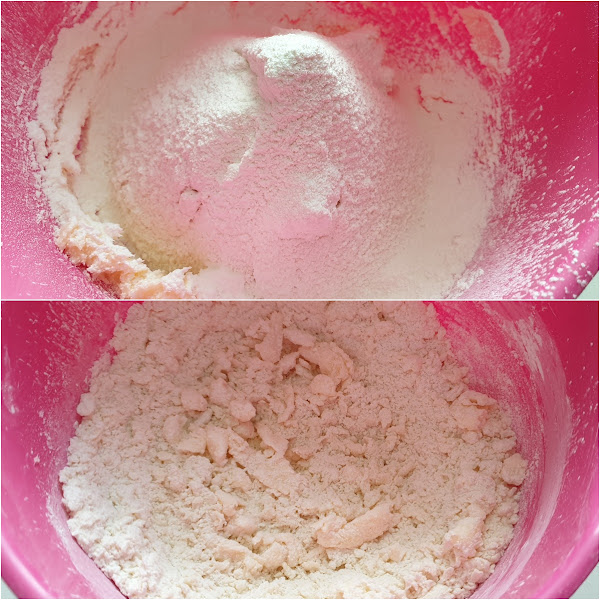 2. - Tamizamos las dos harinas y comenzamos a mezclar con una cuchara, hasta que queden grumitos, entonces lo pasamos a la encimera.