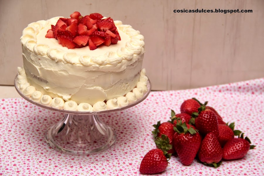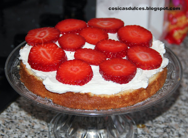 Sobre la crema colocamos una capa de fresas cortadas en láminas y antes de poner el segundo disco de bizcocho colocamos de nuevo crema para cubrir las fresas (de esta forma las fresas quedarán ocultas entre dos capas de crema.