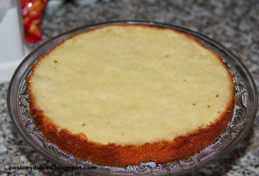 Una vez que tengamos nuestro bizcocho listo lo liamos en papel film y lo dejamos reposar unas horas para que se asiente la miga (mejor de un día para otro). Cortamos nuestro bizcocho en tres discos. Colocamos el primer disco y lo calamos con el almíbar que debe estar frío.