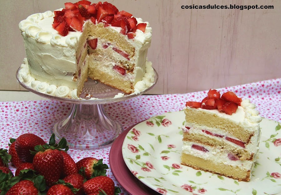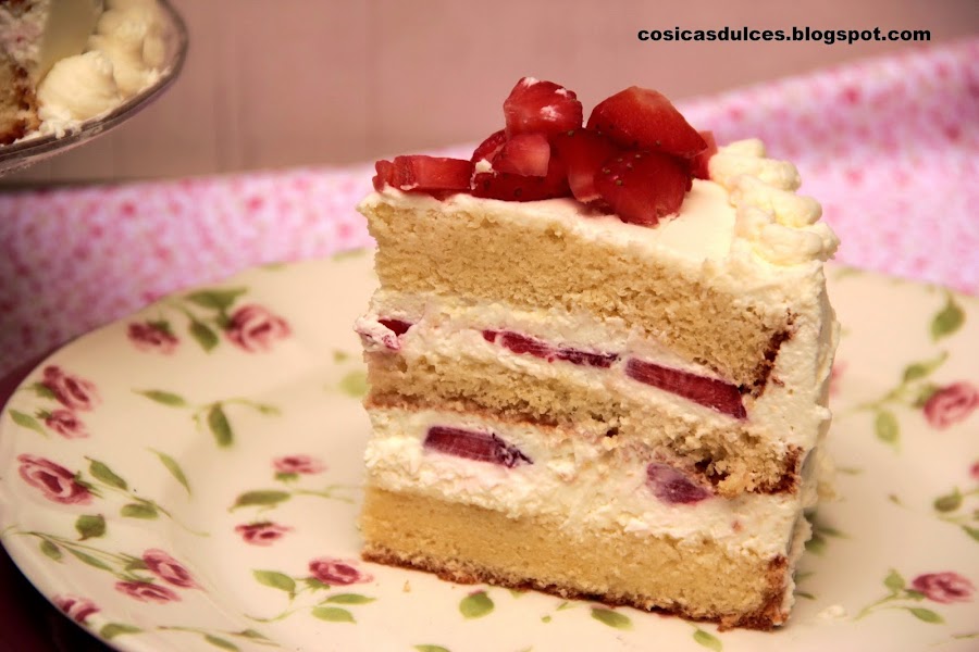 En esta foto del corte podéis ver como las rodajas de fresas quedan cubiertas entre dos capas de nata (crema de leche) ¡Una delicia!