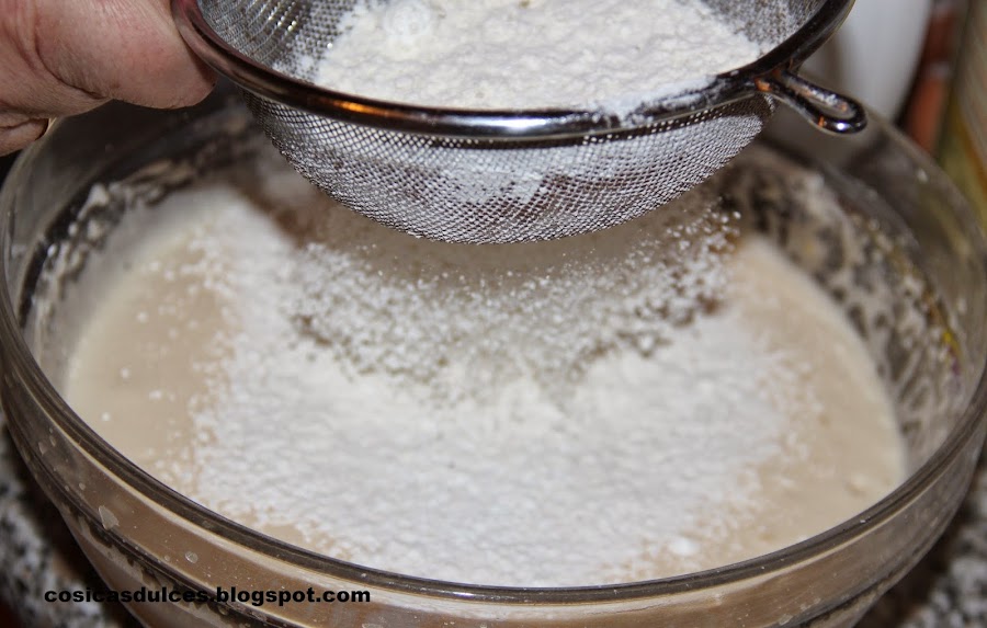 Retiramos el bol del vapor y tamizamos sobre la mezcla harina y la maizena, mezclando con movimientos muy suaves.