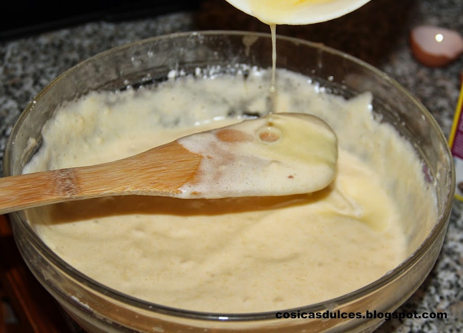 En el microondas calentamos la leche junto con la mantequilla hasta que estén totalmente integradas. Esperamos unos minutos hasta que atempere y vertemos sobre la masa. IMPORTANTE: No debemos añadir la mezcla de leche y mantequilla directamente sobre la masa sino sobre la cuchara de madera (fijaos en la foto de abajo) y en forma de hilo (así evitaremos que la masa baje).