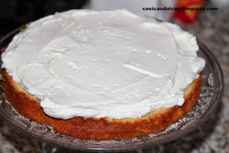 Sobre el disco de bizcocho colocamos una capa generosa de la crema de relleno. Para preparar la crema de relleno colocamos en la batidora la nata (crema de leche), el mascarpone y el azúcar glass y batimos hasta que monte.