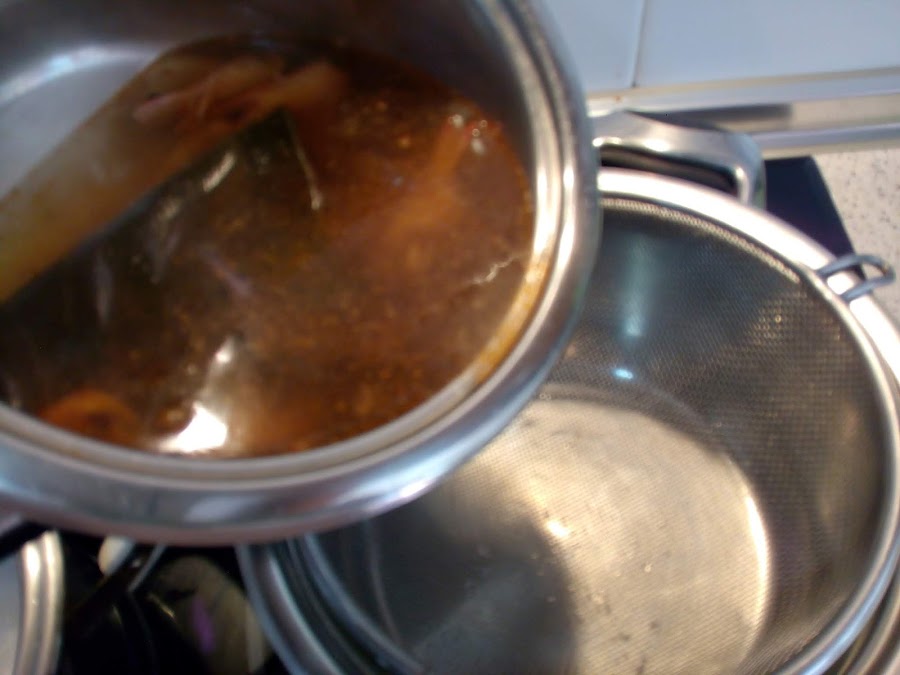 Añadir el caldo de carne y verdura, dejándolo hervir durante unos diez o quince minutos, colar y reservar muy caliente el caldo resultante.