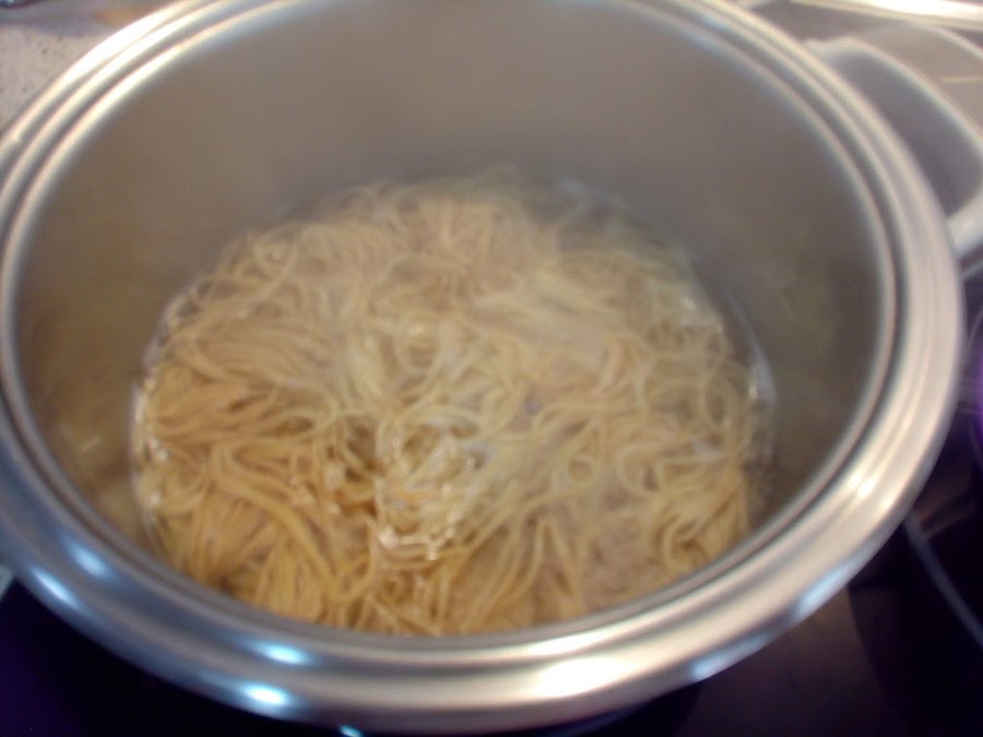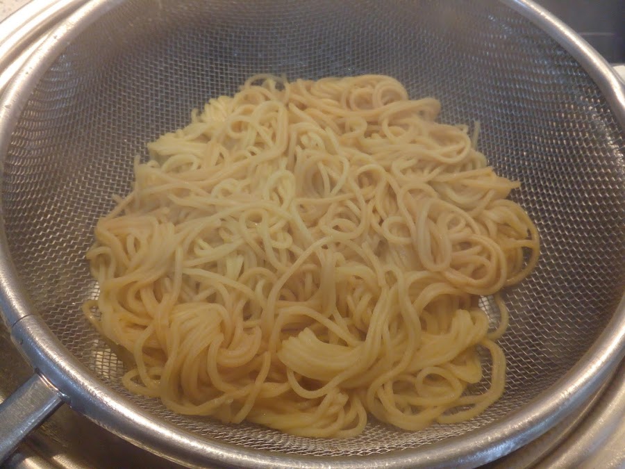 En un cazo echar agua y cocer los fideos ramen siguiendo las instrucciones del fabricante. Una vez cocidos, pasarlos por agua fria para cortar la cocción.