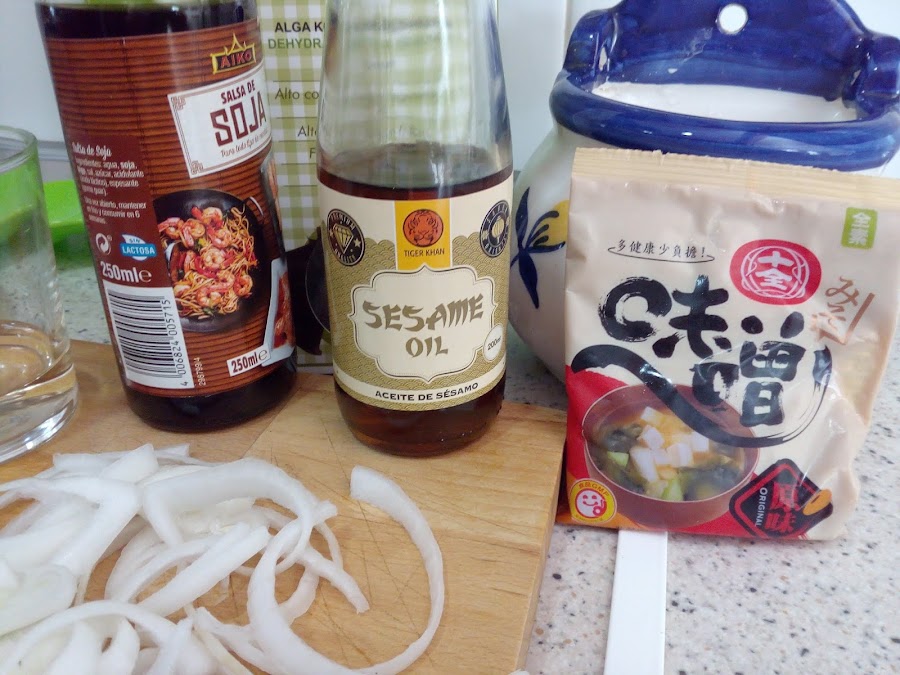 Un vaso pequeño de salsa de soja, medio vaso pequeño de mirin (vino de arroz japonés, en su defecto vino blanco fino-amontillado), dos algas kombu, un trozo de jengibre fresco, un diente de ajo rallado, dos cucharadas soperas de aceite de sésamo y una cucharada de azúcar moreno.
