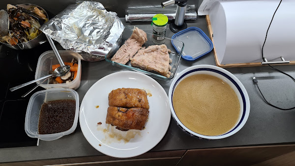 Mientras cuece la primera hora del caldo prepararemos una sartén alta u otra olla con los ingredientes de la salsa.Y cuando saquemos la panceta la meteremos aquí a fuego medio, 2 horas más, con tapa. Dándole la vuelta cada 30 minutos.
