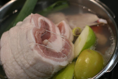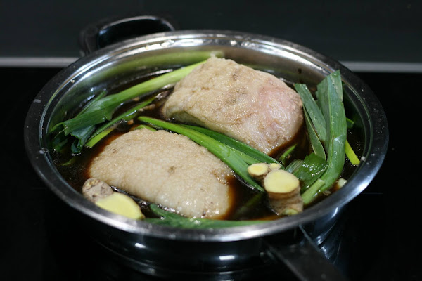 Se puede aprovechar y cocer los huevos aquí también y retirar cuando lleven 6 minutos cociendo. Dejaremos 2 horas cociendo. Cuando lleve una hora retiramos la panceta.
