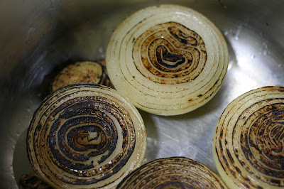 Partimos las cebollas en 2 y el jengibre en laminas gordas y las quemamos. Bien en un sartén, bien con un soplete, o bien con un fuego de gas.