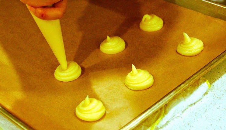 5. Coloca papel de hornear en una bandeja para horno. Cuando la masa enfríe un poco, introdúcela en una bolsa con la esquina cortada o en una manga pastelera para hacer pequeños montículos. Haz 8 o 9 sobre el papel de hornear.