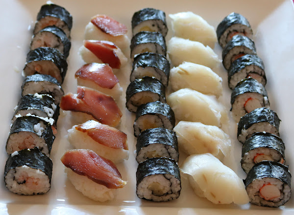 Rellenar cada rollo de lo que más os guste, también como yo unas bolas de arroz y colocar encima salmón, bacalao, atún.... están estupendos y buenos.
