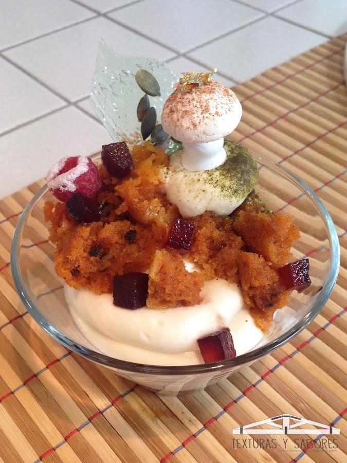 Montaje: Poner una cucharada de almíbar de arrope de base con la manga pastelera rellenar de crema de queso mascarpone, desmigar los lingotes de calabaza que hemos hecho anteriormente, añadir trozos de arrope, con la manga pastelera añadir relleno de calabaza asada y más crema de queso mascarpone. Espolvorear con Té Matcha Japonés y colocar la lagrima de pipas.