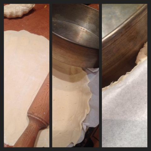 Poner en un molde apto para horno,pinchar con un tenedor la masa plana . Dentro se pone otro molde más pequeño...o un papel de horno con garbanzos secos (algo que haga peso). Se recortan los bordes y se cuece durante 40 minutos a 180 grados.