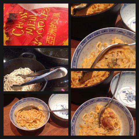 Puse a hervir fideos (estos tardan máximo 3 minutos).... Y luego todo a saltearlo en el wok....