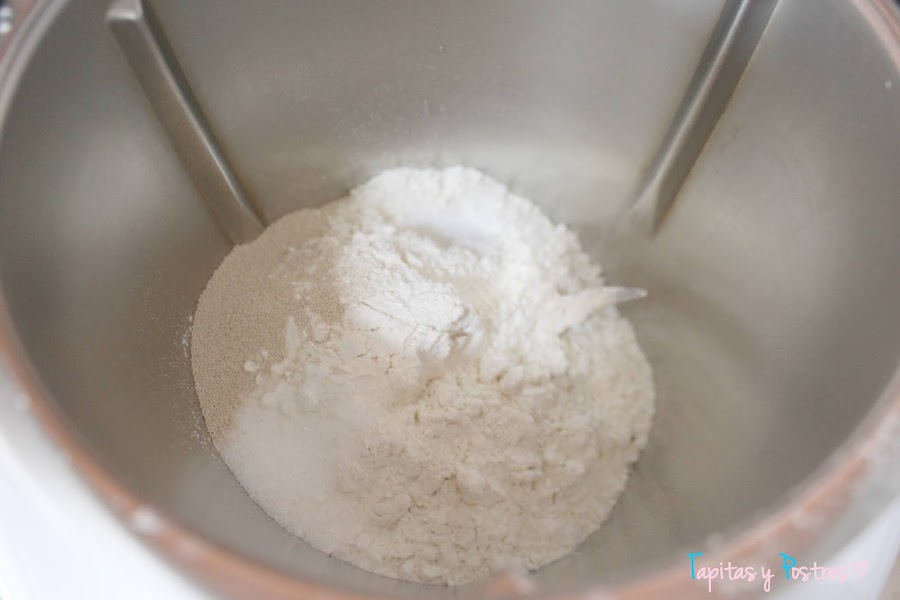 Vamos a usar la thermomix para preparar la masa. Podemos hacerla a mano o en amasadora. Ponemos en el vaso la harina, levadura, sal y azúcar.
