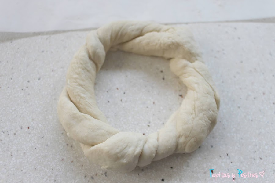 Enrollamos las tiras entre ellas y las unimos. Nos quedará una especie de rosquilla trenzada.