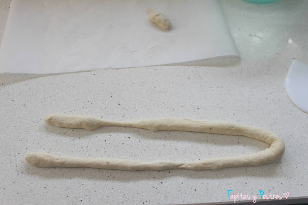 Cogemos cada porción y la estiramos hasta formar un rulito de unos 45 cm, más o menos. Doblamos por la mitad.