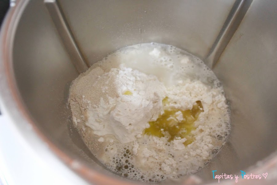 Añadimos el aceite y el agua tibia y programamos 3 minutos en velocidad espiga. Si no tenéis thermomix ni amasadora, poned los ingredientes secos en un recipiente y añadid poco a poco los líquidos hasta integrarlos bien y tener una masa lisa y ligeramente pegajosa.