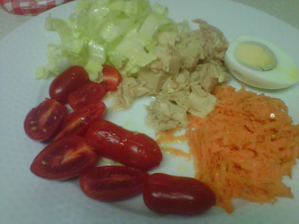 Tomates enanos, atún en lata, zanahoria rallada, huevo duro y ensalada ( no iceberg) el plato es simple pero la verdad que más sano y apetitosa imposible......para una ensalada claro!!! :)