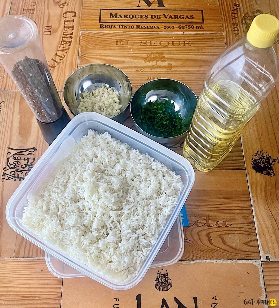 3 tz arroz blanco de grano largo cocido frío (mejor si es del día anterior) (1/2 tz de arroz en crudo)