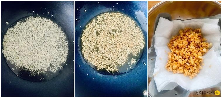 Está claro que la llave en esta receta radica en el ajo, esa será tu mayor preocupación, debes estar muy atento para que no te pases de cocción y no se te queme, sino, esto será un verdadero desastre. Aquí el ajo no solo tiene la función dar sabor y aportar ese toque crispy al arroz, sino también la de infusionar el aceite dónde freiremos el arroz, redondeando así toda la preparación. Controlado el tema del ajo, el resto es más que rápido y fácil.