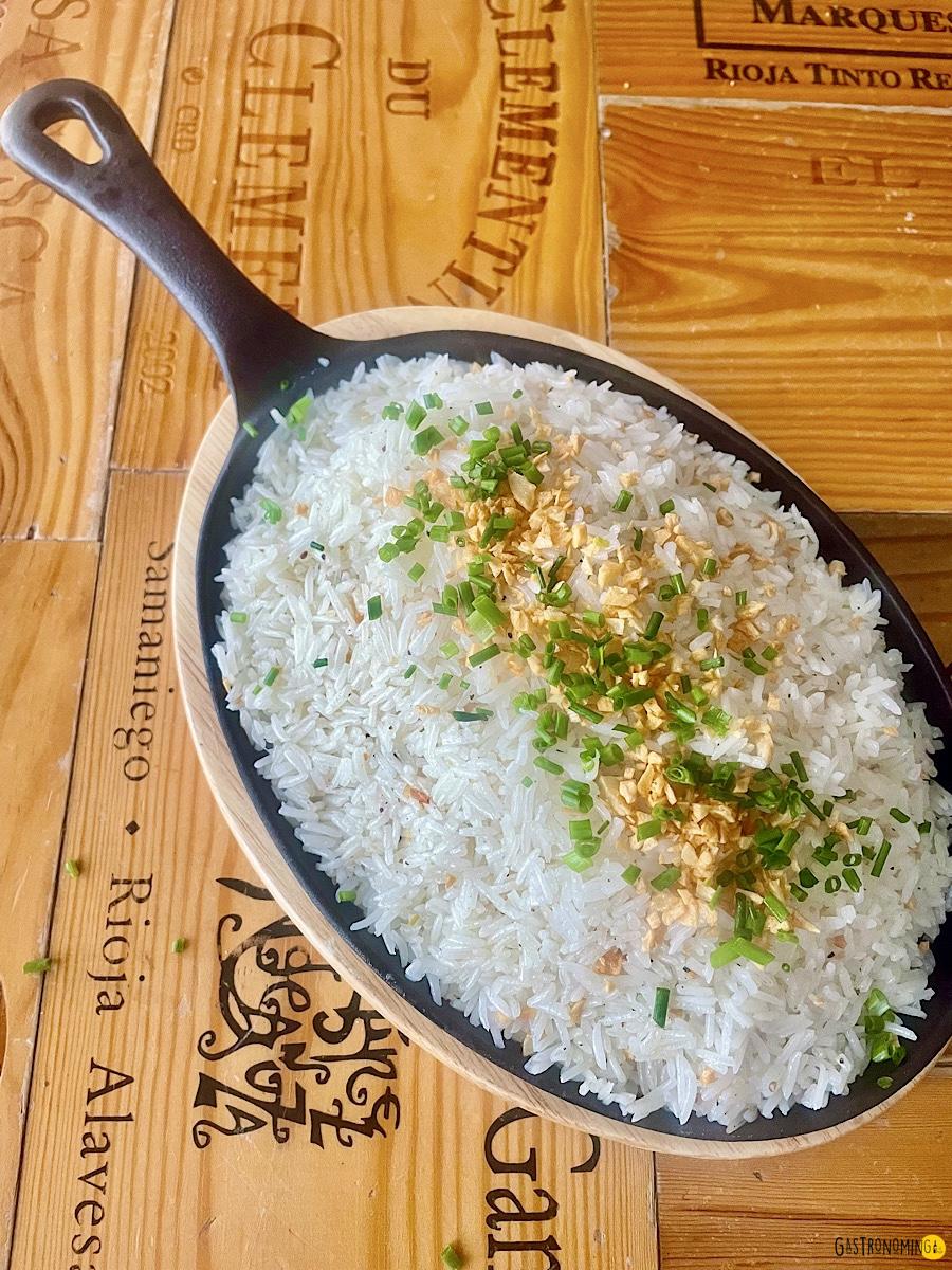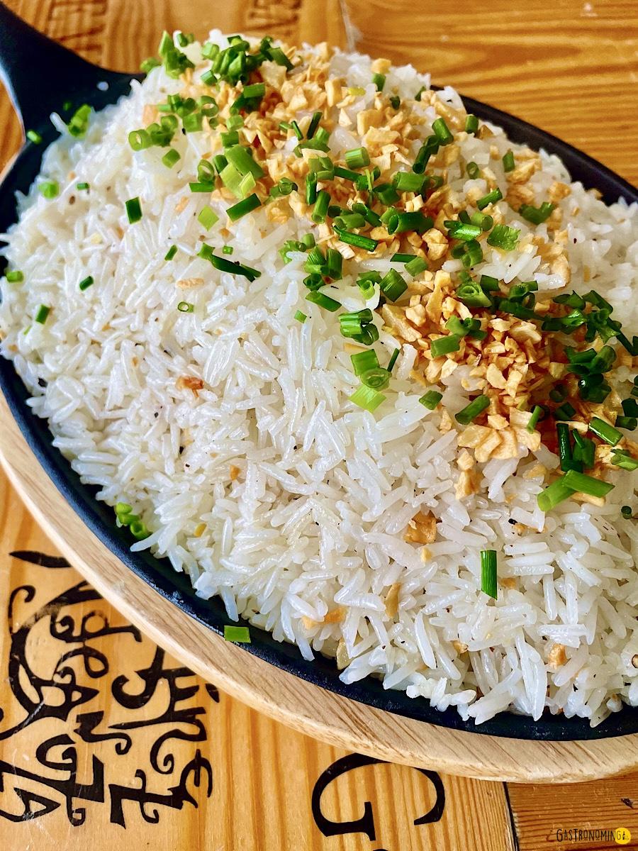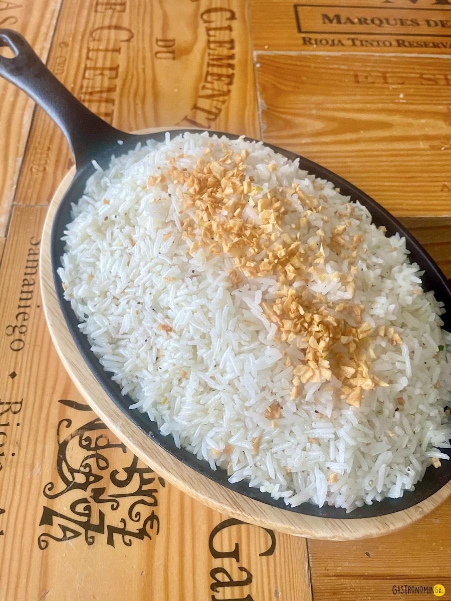 El arroz que debes usar es un arroz blanco de grano largo cocido de la manera habitual, ya sabes, arroz, aceite, unos ajos, agua y su pizca de sal, nada más es necesario. Como es costumbre con este arroz, lo puedes comer desde el desayuno, hasta la cena, no es broma, es el desayuno favorito en Filipinas, pero créeme si te digo que es espectacular para acompañar pescados y carnes fritas o hechas a la parrilla, además de los huevos fritos claro está.
