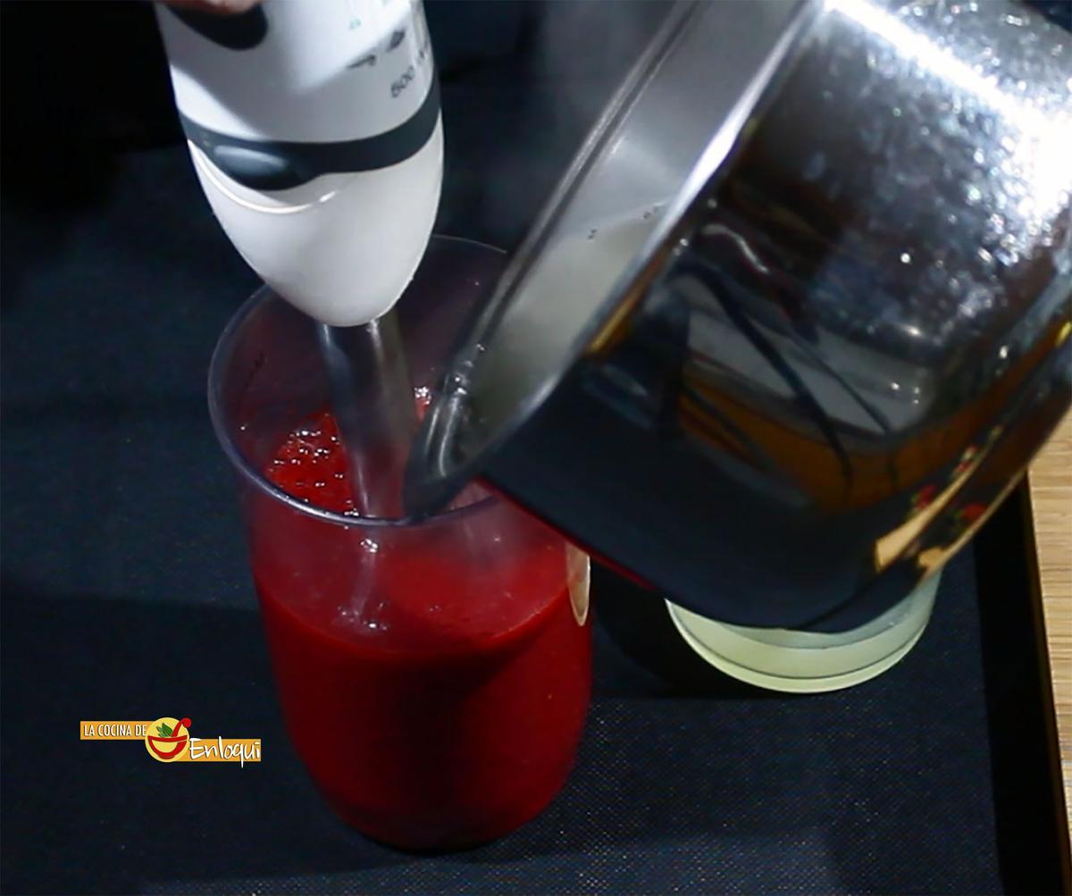 Mientras tanto prepara las fresas. Lávalas y retira las hojas verdes. Ponlas en el vaso de la batidora y tritura hasta que queden bien licuadas. A continuación añade el jarabe que hemos preparado antes junto con un chorrito de zumo de limón y bátelo todo.